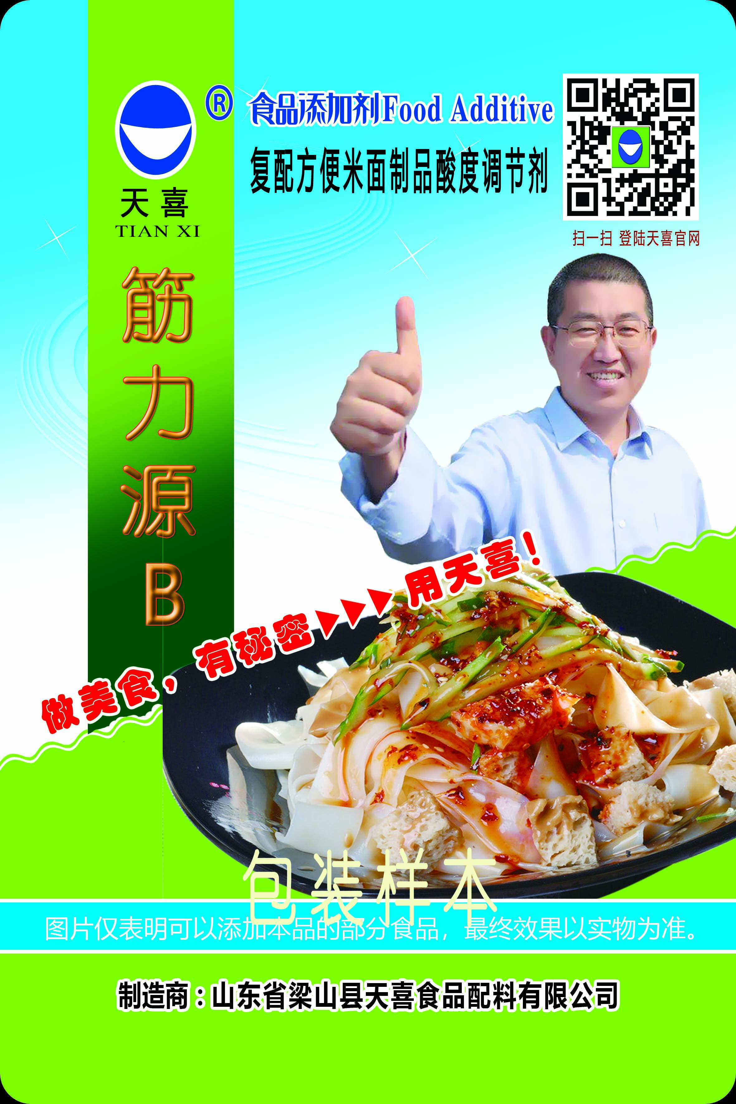 ★商品名:天喜牌筋力源B型 产品名称:筋力源牌复配方便米面制品酸度调节剂 型号:JLY-B 筋力源牌复配方便米面制品酸度调节剂 本品按照《食品安全国家标准 食品添加剂使用标准GB2760》及补充规定的品种、应用分类、使用范围、最大使用量、残留量等科学组方,并且按照《食品安全国家标准 复配食品添加剂通则GB26687》精心配制而成。本品已经通过食品生产许可,保障食品安全。用户按照本说明的用法用量生产制作的方便米面制品(食品分类号:06.07)、冷冻米面制品(食品分类号:06.08)既不会超标也不会超量。